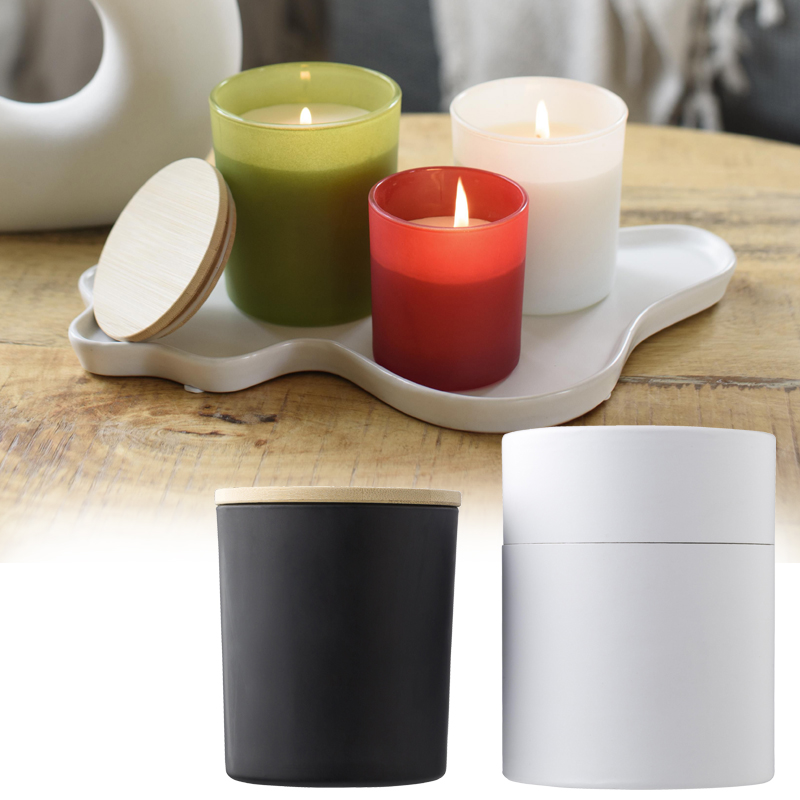 Glazen kaars met plantaardige was en een deksel van bamboe.
