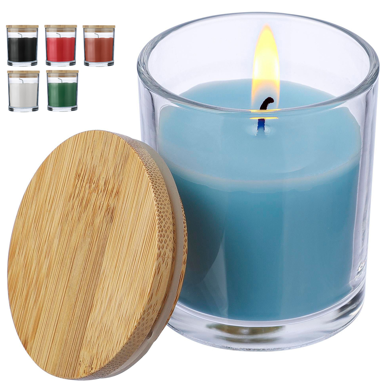 Glazen kaars met 120 gram gekleurde was en een vanillegeur, in een transparante glazen houder met bamboedeksel.