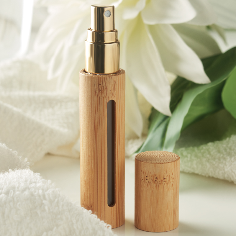 Navulbare mini parfumverstuiver met bamboe behuizing.