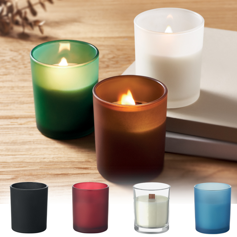 Plantaardige waxkaars met vanillegeur in glazen houder met houten lont.