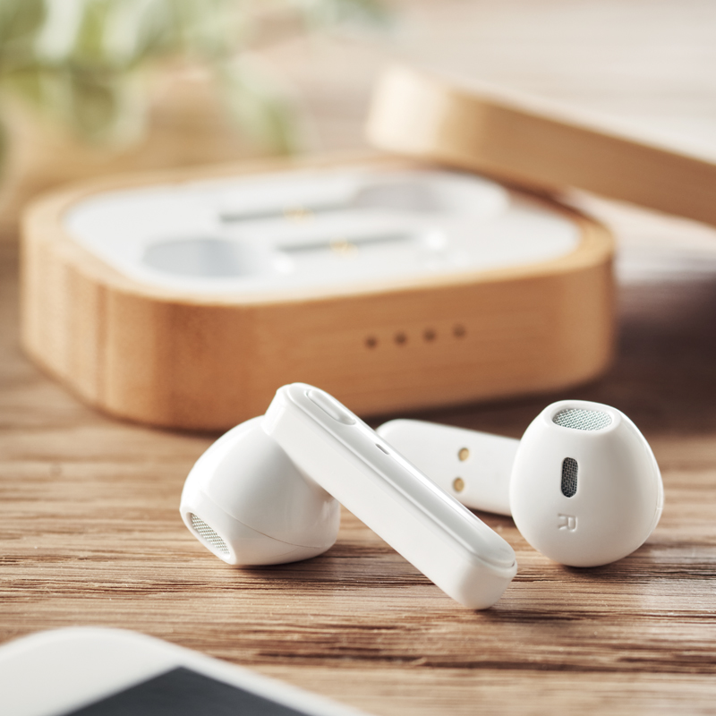 Set van 2 True Wireless Stereo (TWS) 5,0 oordopjes in bamboe behuizing met ingebouwde 30 mAh batterij.