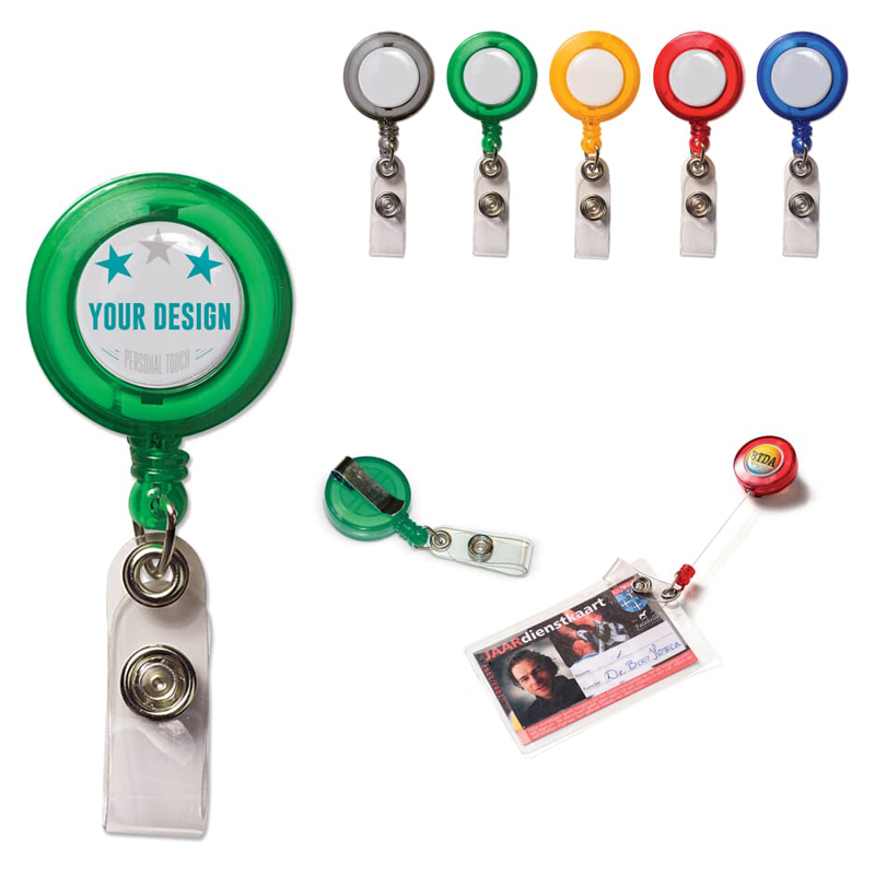 Transparante kaarthouder met trekkoord en clip.