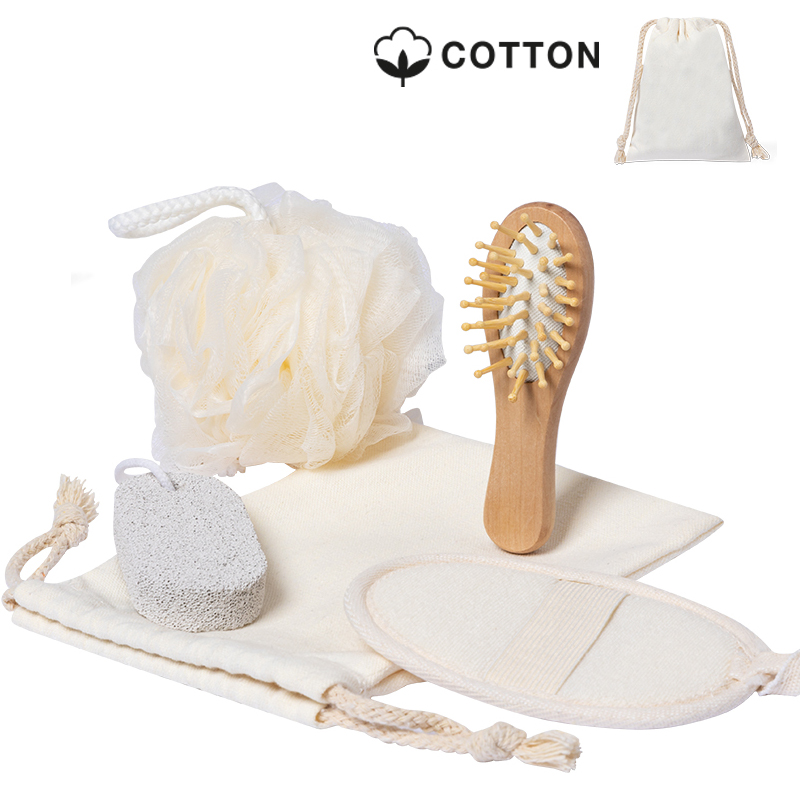 Complete badset met 4 accessoires, gepresenteerd in een praktische, zelfsluitende katoenen tas.