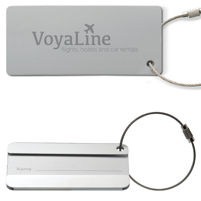 Aluminium, rechthoekig bagagelabel met ijzerdraad en draaislotje.