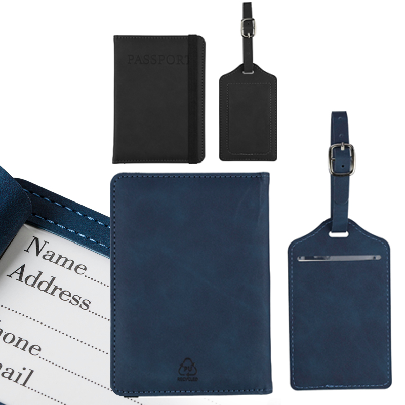 Paspoorthouder en bagagelabel van gerecycled PU, samen verpakt in een bruine kartonnen doos met illustratie.