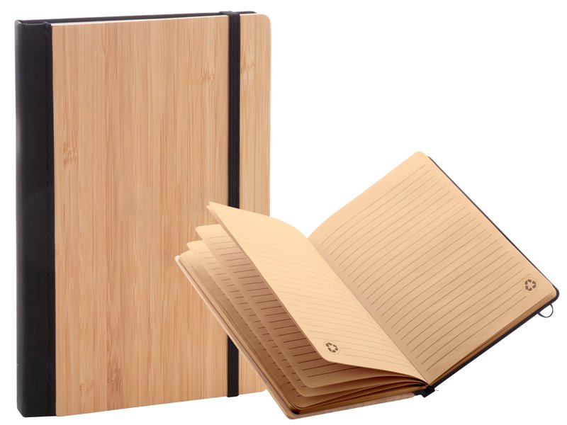 Notitieboek met bamboe en PU-leer, 80 gelinieerde vellen van gerecycled papier, bladwijzer en rubberen band.