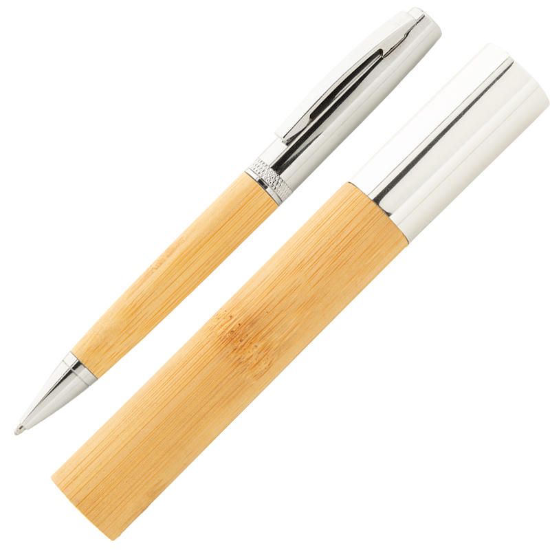 Elegante, metalen balpen met draaimechanisme, bamboe houder en glanzende chromen onderdelen.