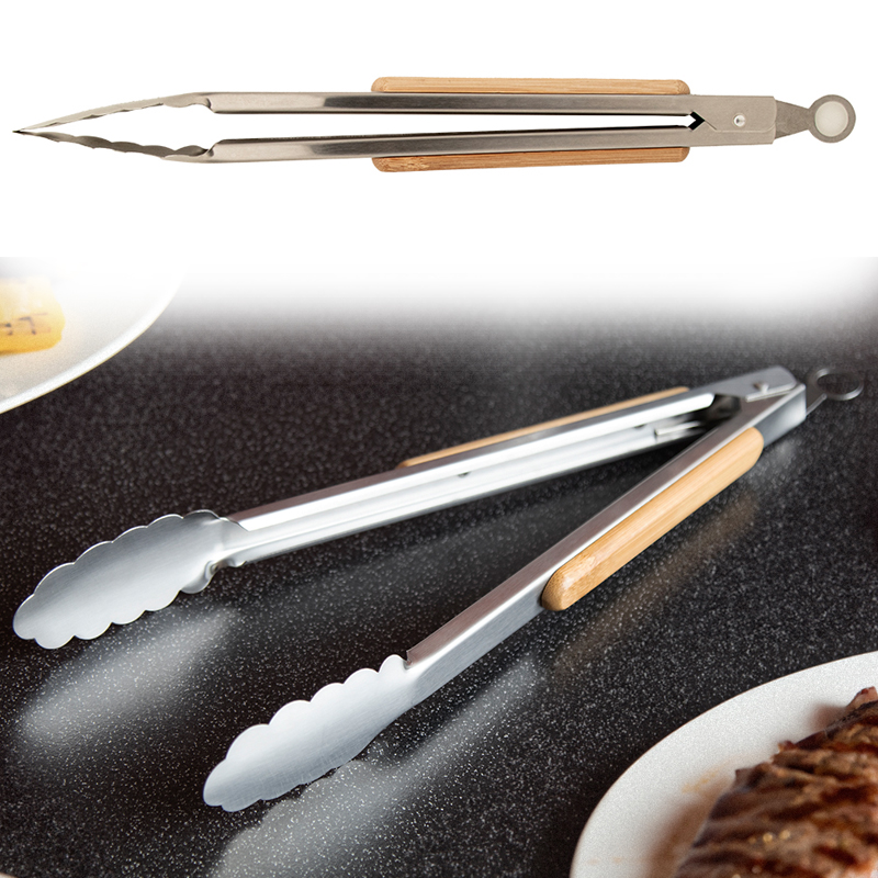 Roestvrijstalen BBQ-tang met bamboehengsels en vergrendelingsmechanisme.