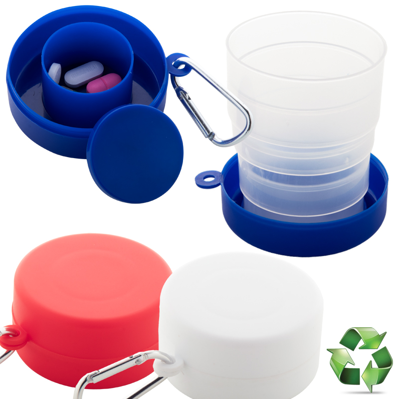 Opvouwbare beker van gerecycled PP-plastic met pillendoosje en metalen karabijnhaak.