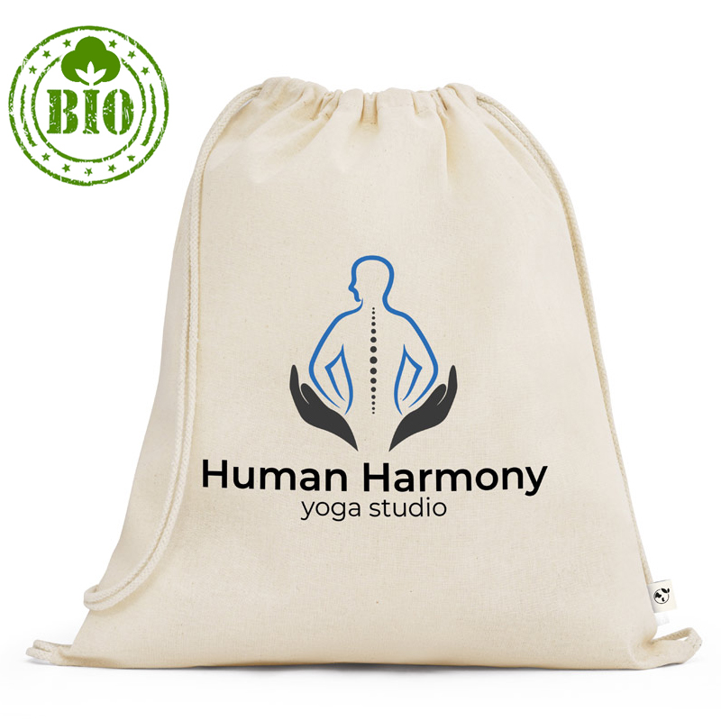 Rugzak van 100% biologisch katoen (140 g/m2), met katoenen handvatten voor sluiting.