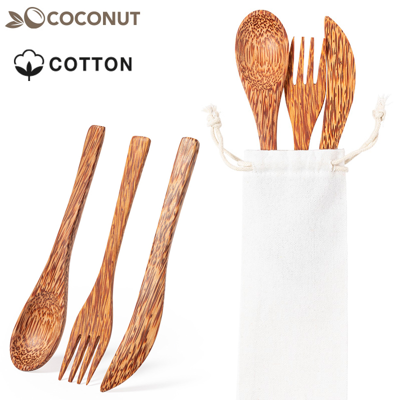 Natuurlijn, herbruikbare bestekset gemaakt van kokosnoot.