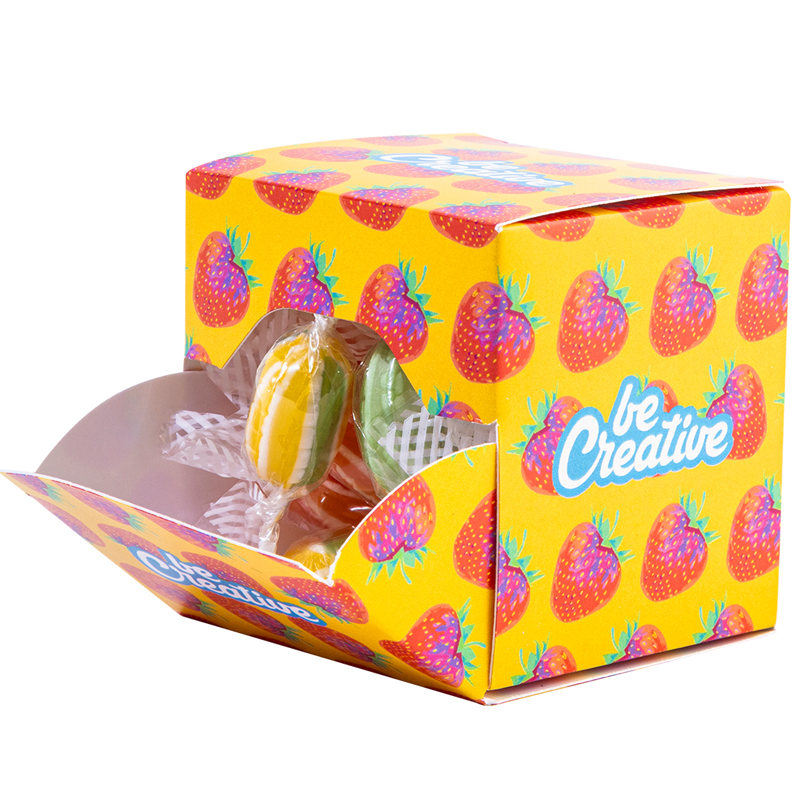 Custom made, kubusvormige snoepdispenserdoos met all-over full colour bedrukking.