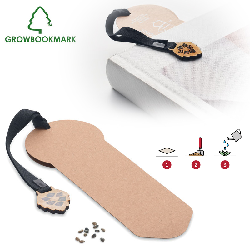 Geef een boom terug aan de aarde met een duurzame boekenlegger van FSC- papier met katoenen touw. Inclusief pijnboomzaden (pinus nigra) die de planeet nieuw leven geven.