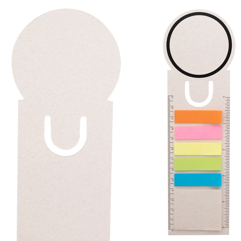Boekenlegger en liniaal van gerecycleerd melkpakpapier met 15 sticky notes en 75 bladwijzers (in 5 verschillende kleuren).
