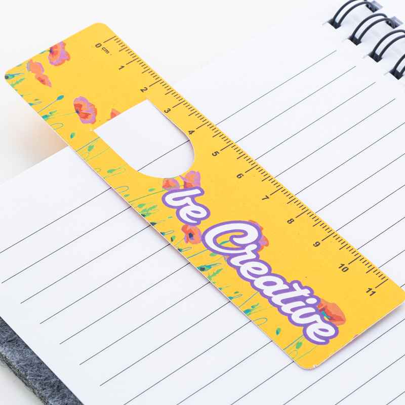 Custom made papieren boekenlegger met 11 cm liniaal en full colour bedrukking op de voorzijde.