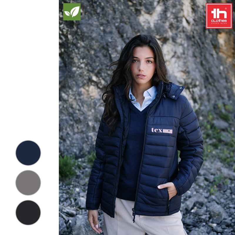 Damesjas met capuchon van 100% gerecycled nylon ripstop (350 g/m2), de binnenkant is gevoerd met 100% gerecycled nylon taffeta (350 g/m2) voor meer draagcomfort.