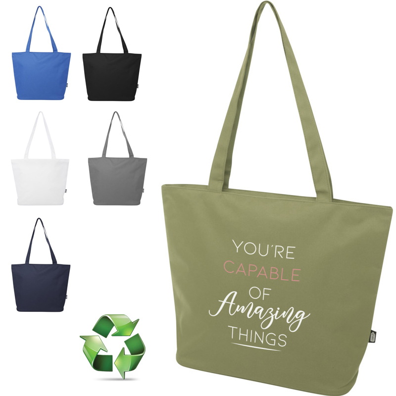 De Panama GRS gerecyclede draagtas met ritssluiting, gemaakt van waterafstotend 600D RPET, is een perfecte en duurzame multifunctionele tas voor naar een evenement, naar het strand of om boodschappen mee te doen.