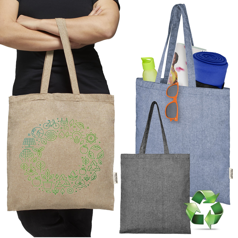 Draagtas van een mix van 150 g/m2 gerecycled katoen en polyester.