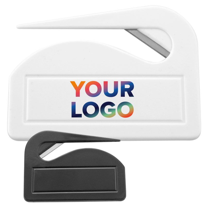 Kunststof briefopener met metalen snijgedeelte.