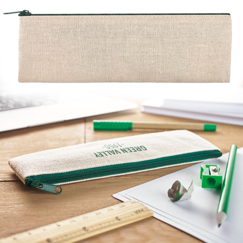 Etuitje van jute en katoen, inclusief bamboe liniaal, puntenslijper, gum, potlood en kartonnen balpen.