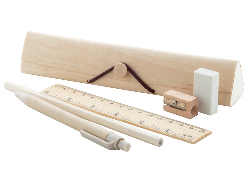 Inclusief gerecycled papier balpen (met blauwe vulling), potlood (HB, ongeslepen), liniaal 15 cm, puntenslijper en gum.