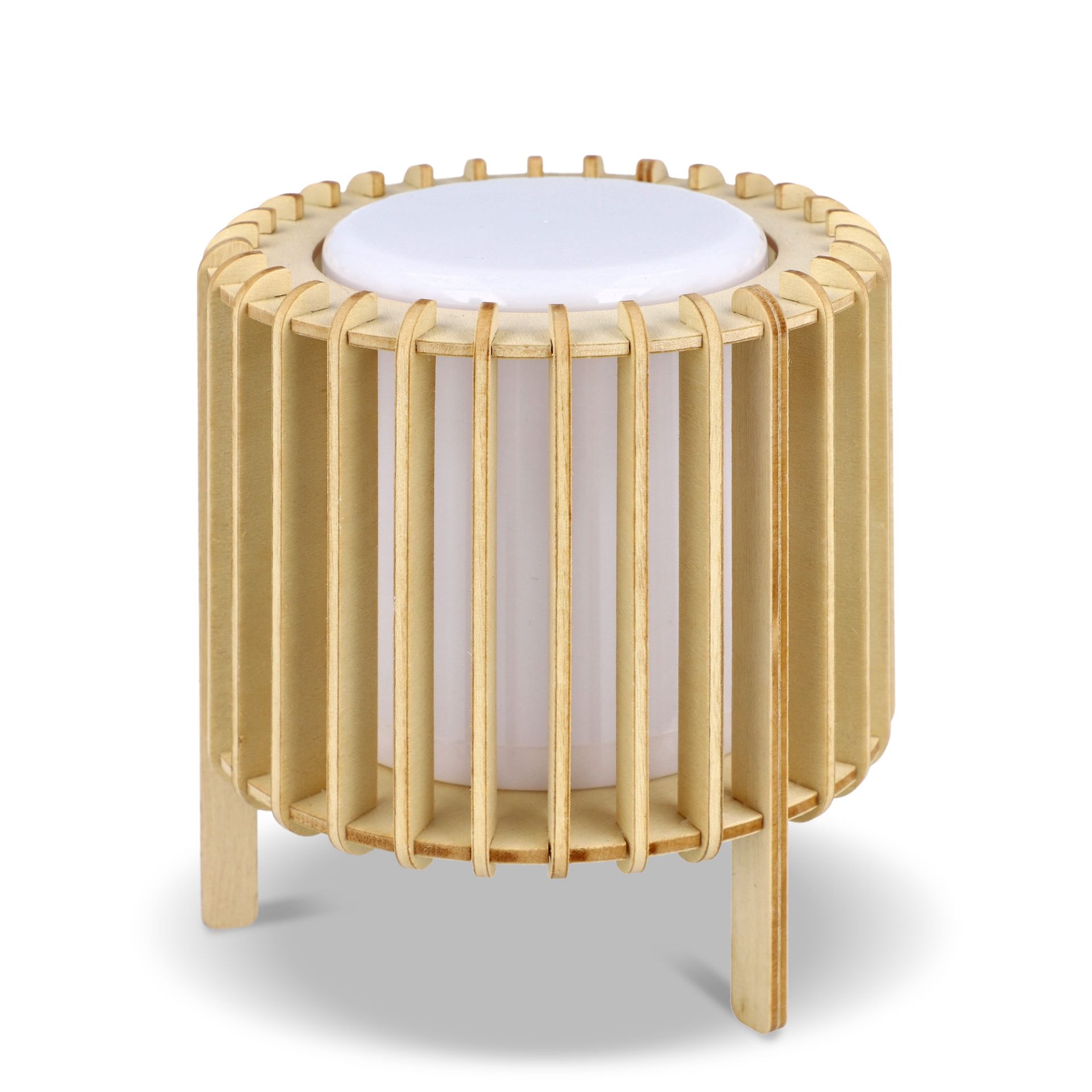Met zijn rechte, herkenbare verticale houten lamellen en drie houten poten is deze compacte lamp praktisch en veelzijdig.