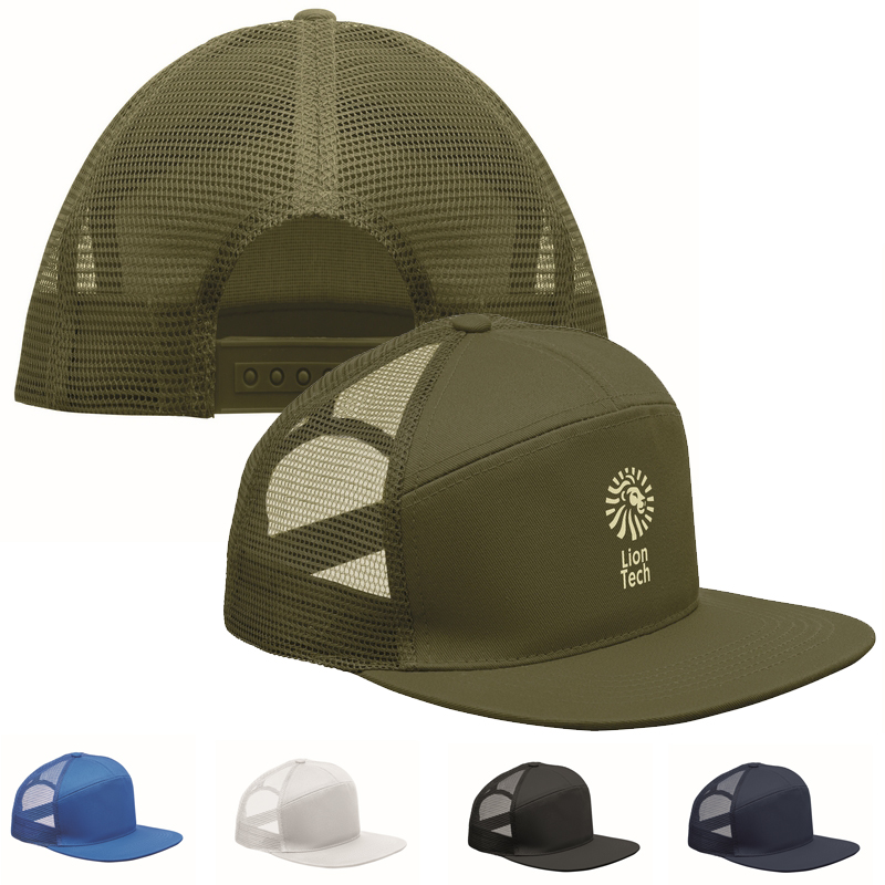 7 panelen platte vizier pet van katoenen twill 235g/m² met polyester mesh achterkant en plastic sluiting.