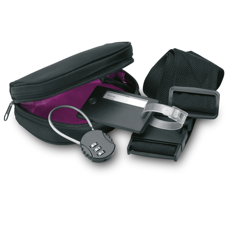 Reisset bestaande uit een bagagelabel, kofferriem en kofferslotje.