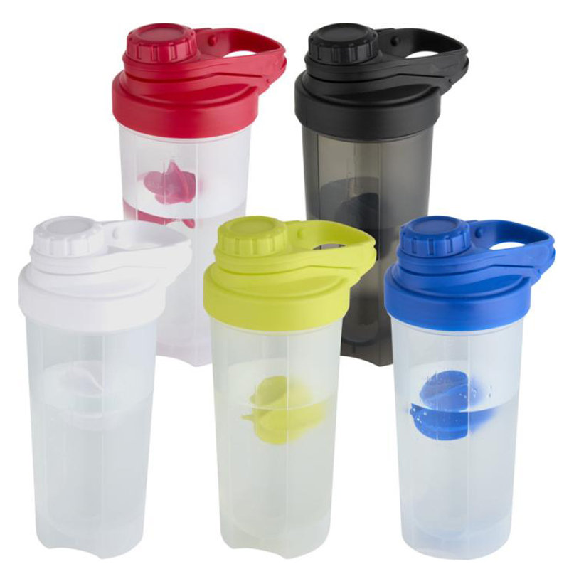 Deze enkelwandige plastic sportfles is ontworpen voor fitness en dagelijkse hydratatie en wordt geleverd met een shakerbal voor het gemakkelijk mixen van proteïneshakes.