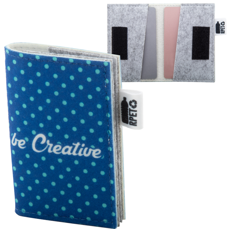 Op maat gemaakte, RPET vilten creditcardhouder met 2 kaartgleuven, klittenbandsluiting en full colour bedrukte cover.