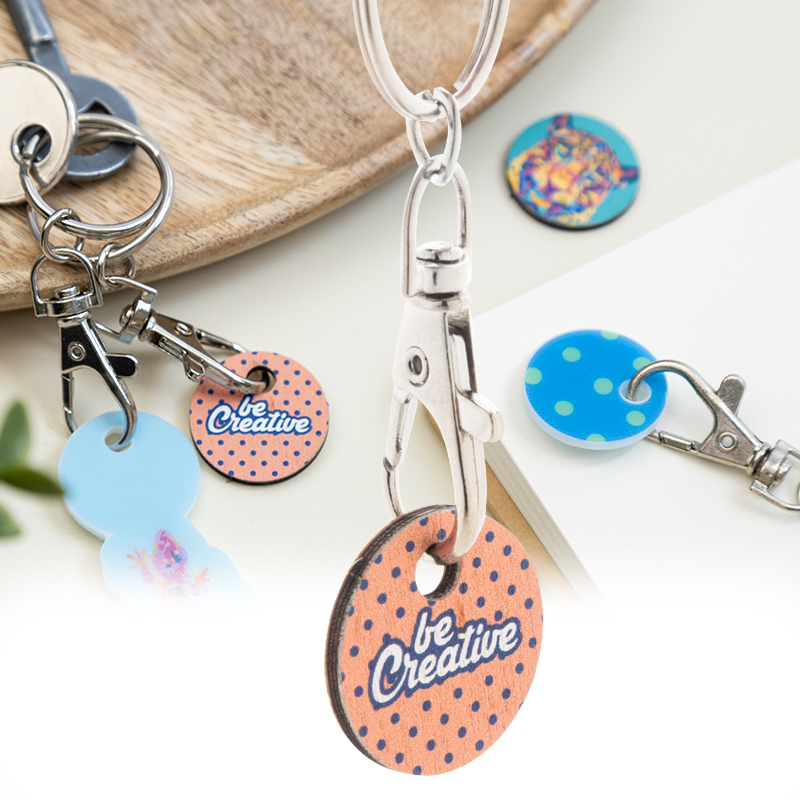 Metalen karabijnhaak sleutelhanger met full colour bedrukte triplex winkelwagen munt.