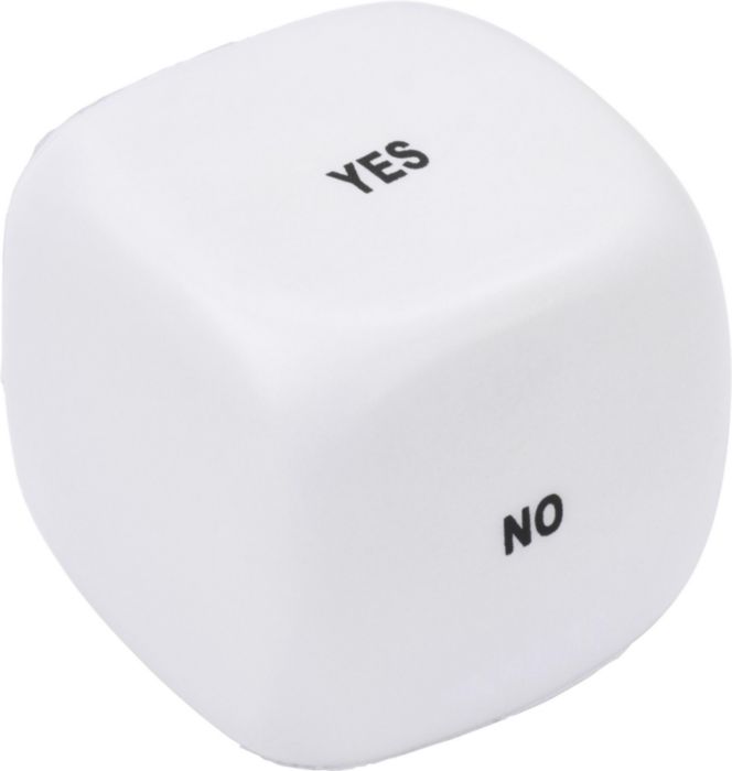 Anti–stress figuur en decision maker van PU foam, model 'dobbelsteen met tekst.