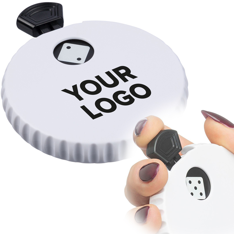 Mechanische dobbelsteen van gerecycled ABS met drukknop aan de bovenkant.