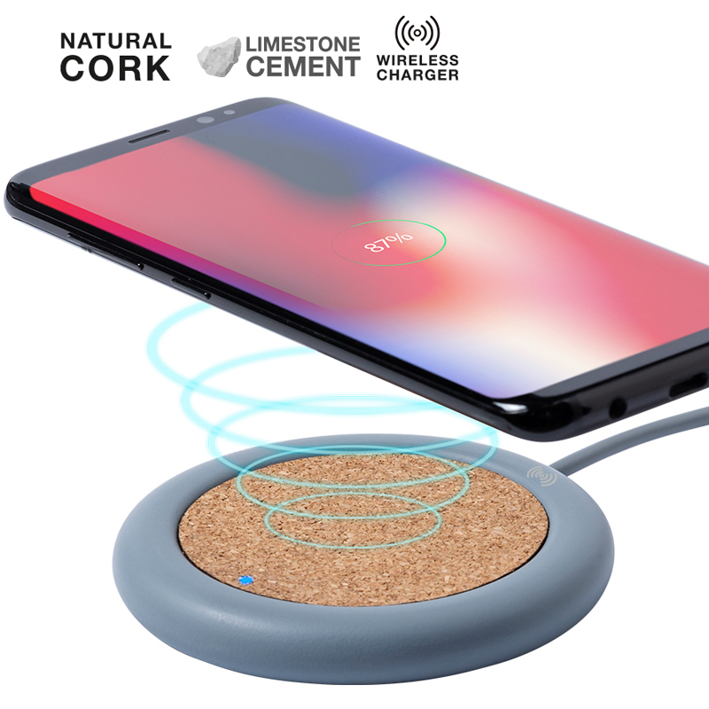 5W draadloze oplader van de natuur lijn en cirkelvormig ontwerp, in combinatie van natuurlijke kurk en kalksteen cement, een conglomeraat gevormd door het mengsel van natuurlijke materialen, voornamelijk gemalen kalksteen en water, het verkrijgen van een