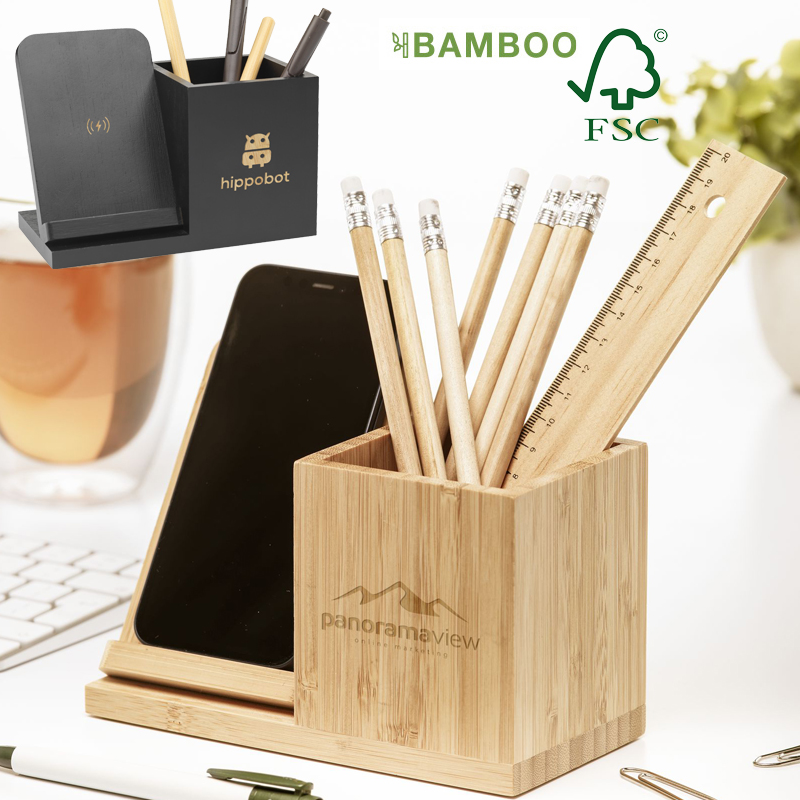 Milieuvriendelijke, duurzame draadloze 15W oplaadstandaard en pennenhouder in één.