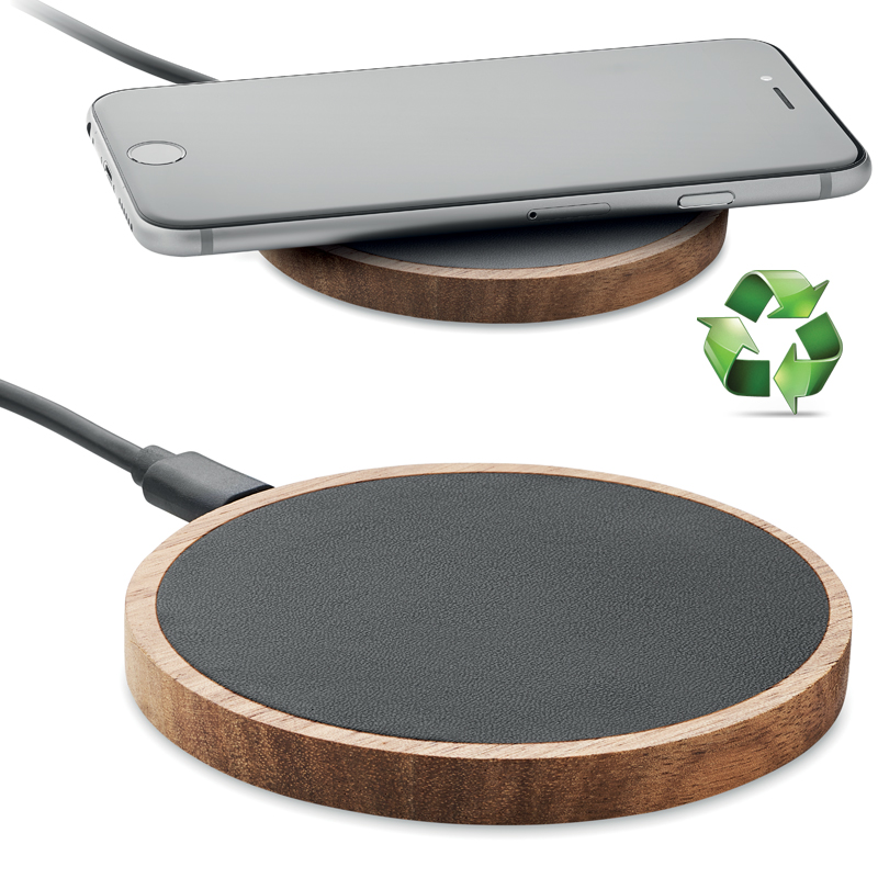 Draadloze oplader van acaciahout en gerecycled PU, waarvan 58% gerecycled is (40% gerecycled polyester en 18% gerecycled PU).
