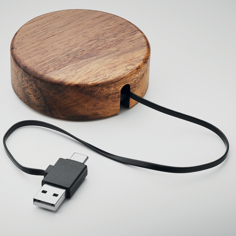Draadloze oplader van acaciahout met intrekbare kabel.