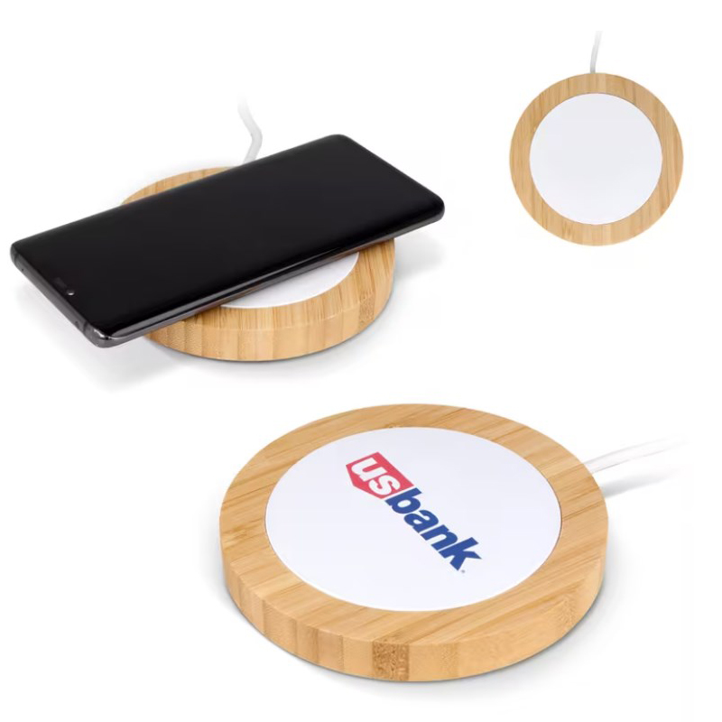 Draadloze oplader, gemaakt met bamboe en gerecycled abs-materiaal.