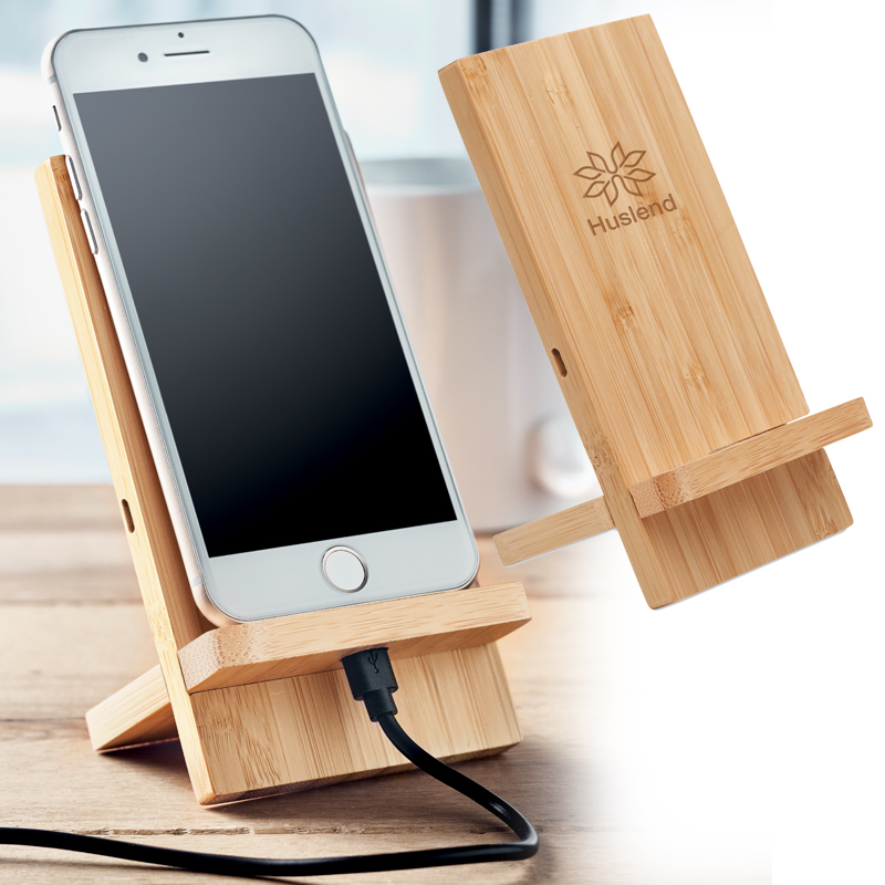 Draadloze double coil oplader/ telefoonstandaard van bamboe.