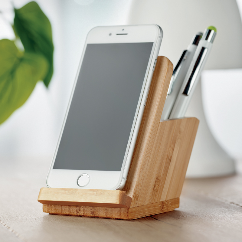 Handig bureau item; een pennenbakje en telefoonstandaard van bamboe met geïntegreerde double coil draadloze oplader geschikt voor 1 smartphone.