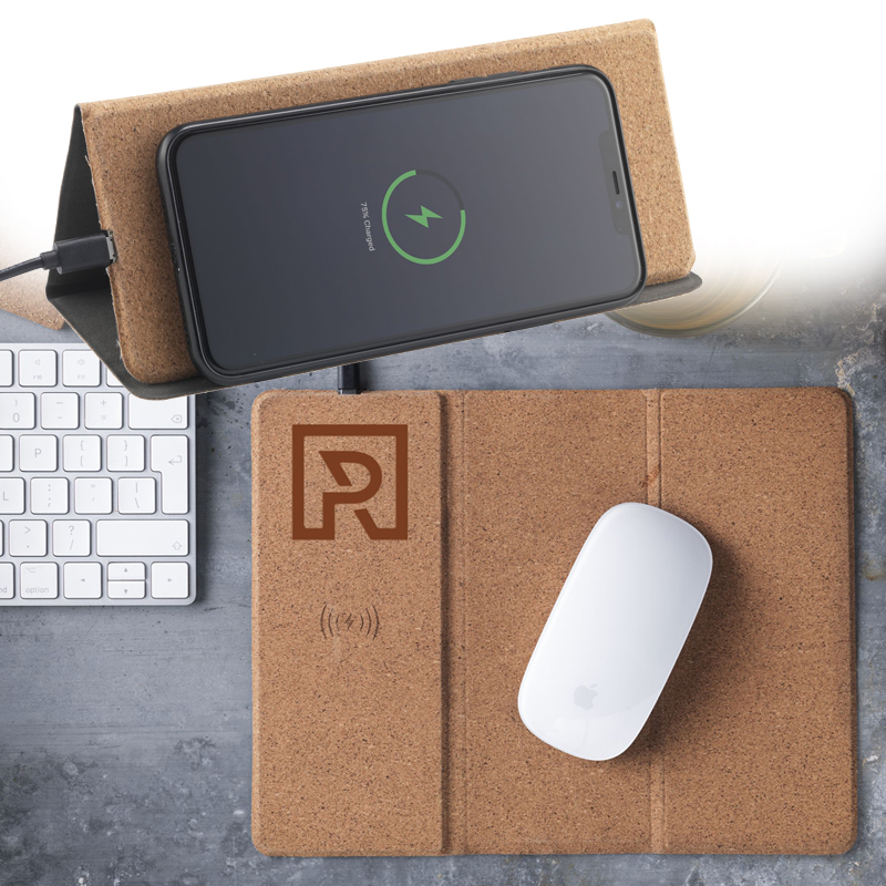 Op deze kurken muismat kun je moeiteloos je muis navigeren en daarnaast kun je je smartphone opladen.