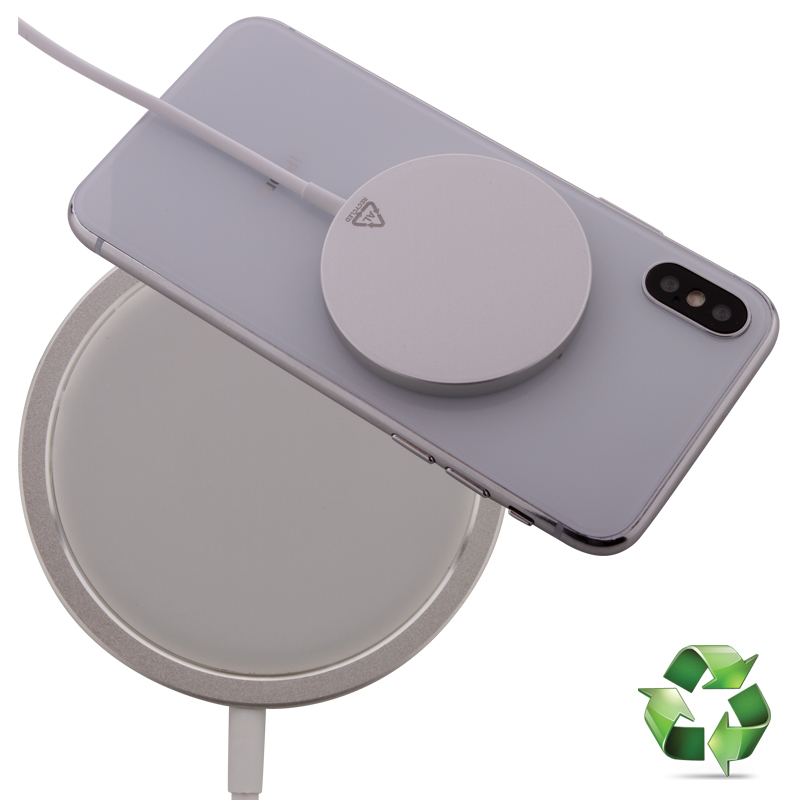 Magnetische draadloze snellader (10W) in gerecycled aluminium behuizing.