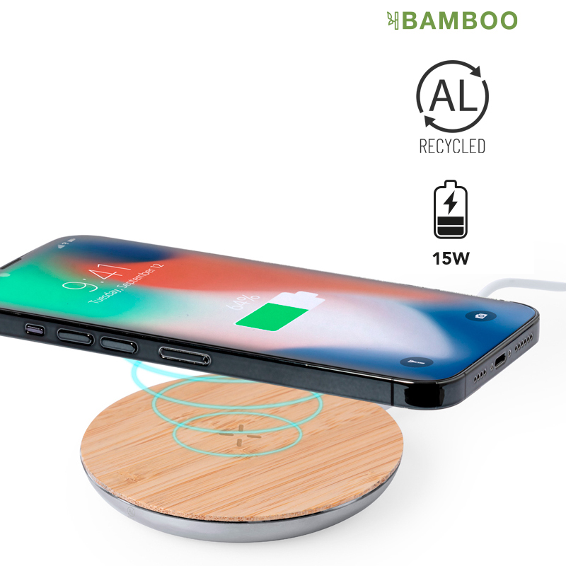 Draadloze oplader 15W met rond ontwerp, behuizing van gerecycled aluminium en oplaadbasis van bamboe.
