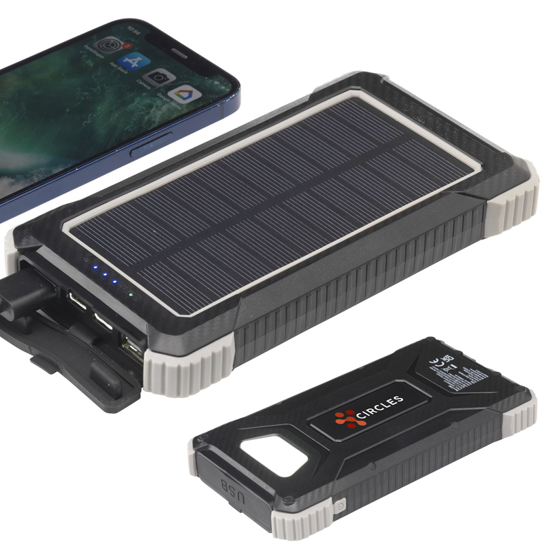 Stoere outdoor solar 10000 mAh powerbank met een behuizing van gerecycled ABS met beschermende siliconen stootranden op de hoeken.