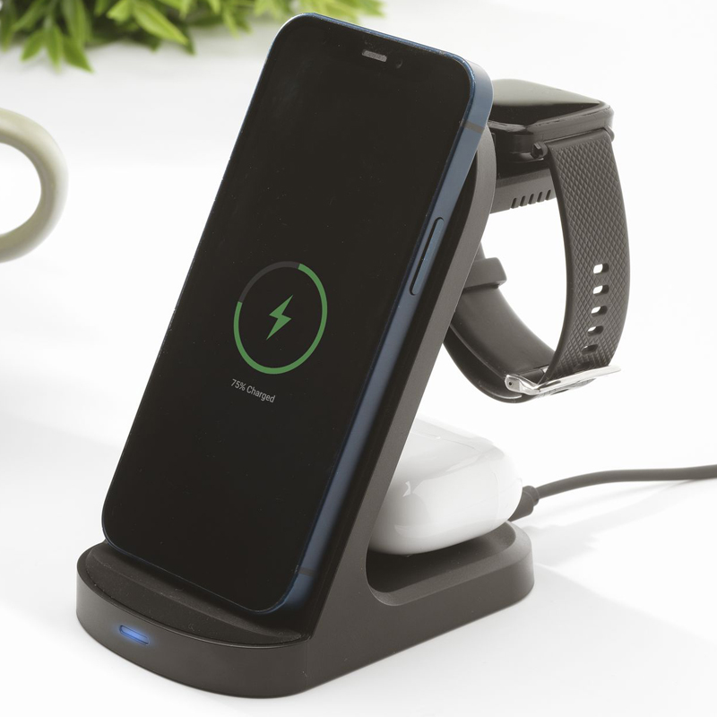 Stevige 3-in-1 oplaadstandaard van gereycled ABS.