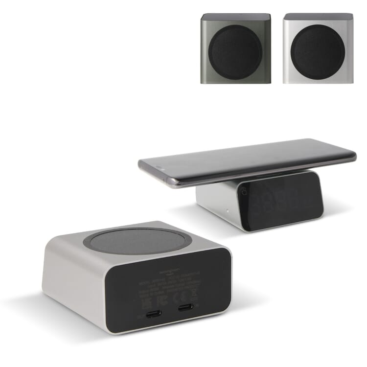 Onze GRS-gecertificeerde klok met draadloze oplader, vervaardigd van gerecycled aluminium, levert snelle 15W oplaadcapaciteit.