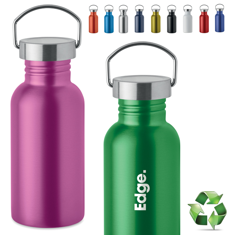 Enkelwandige fles van gerecycled roestvrij staal (90% gerecycled roestvrij staal en 10% roestvrij staal) met deksel en handvat.