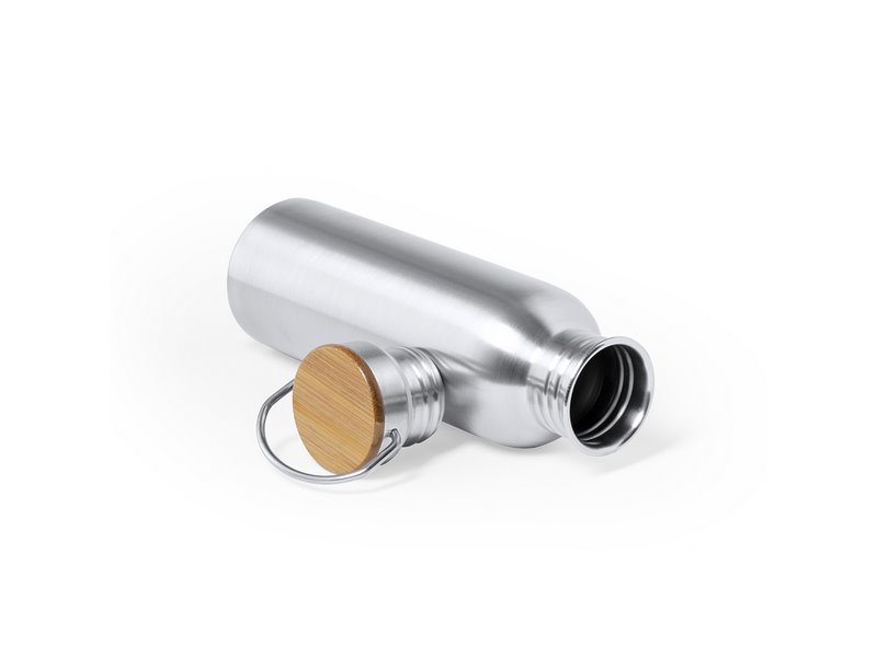 Roestvrijstalen behuizing en bamboe dop met metalen handvat.