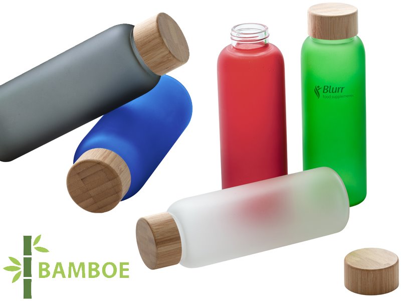 Matte fles van borosilicaatglas met deksel van bamboe en een inhoud tot 500 ml.