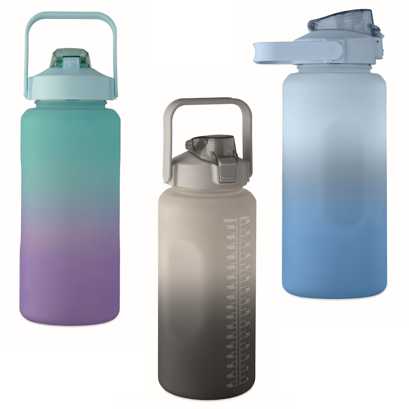 Motiverende drinkfles van RPET met flip–top deksel (éénhandig te openen), rietje, veiligheidsvergrendeling en draaggreep.